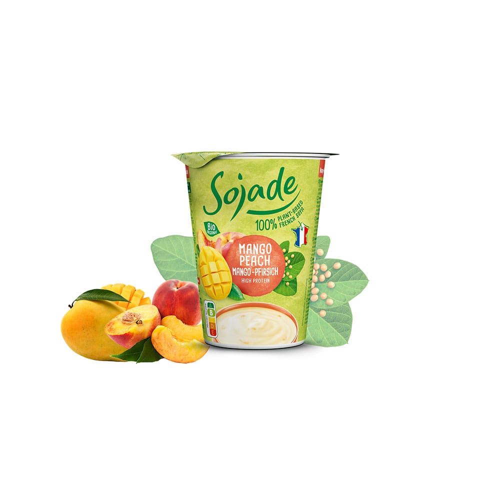 Sojade Organic Mango and Peach Soya Yogurt delivers a smooth plant-based option combining rich soya protein with vibrant mango and peach pieces in a 400g pack.