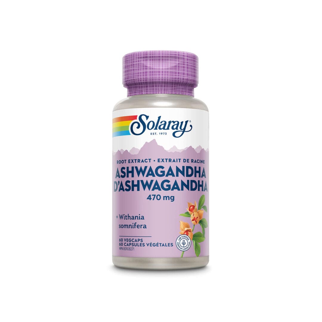 Solaray Ashwagandha 470mg capsules deliver 1.5% withanolides, promoting natural stress management and wellbeing. Supplied in 60-capsule packs for easy handling.