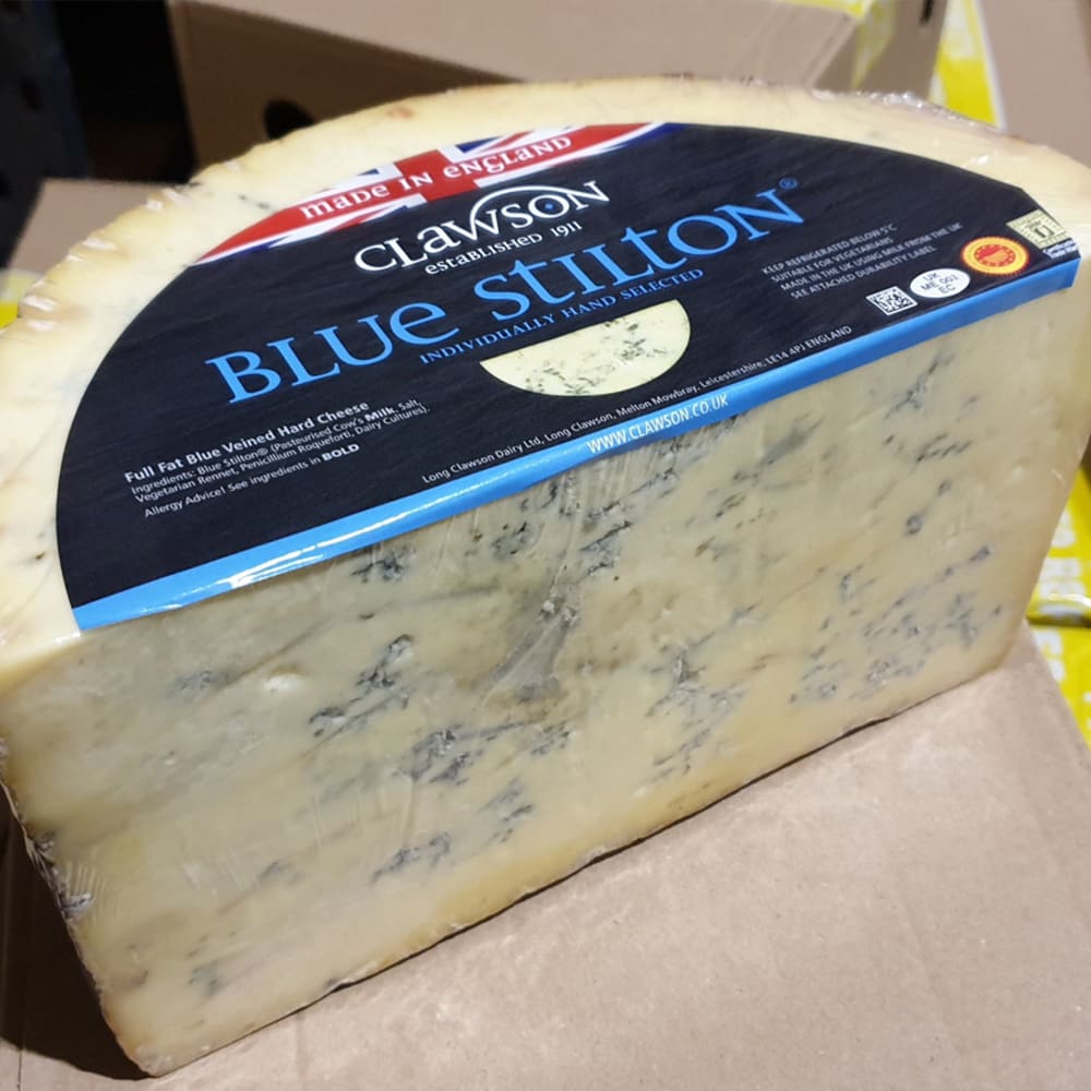 Premium Stilton quarter cheese per kg offering a smooth, creamy texture and distinctive blue veins. Ideal for enhancing cheese boards and gourmet dishes.