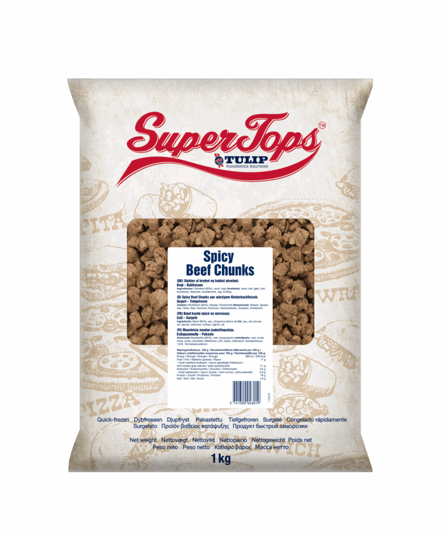 Add fiery flavour with Supertops Spicy Beef Chunks, a premium 1kg pizza topping ideal for creating bold, memorable dishes with authentic taste.