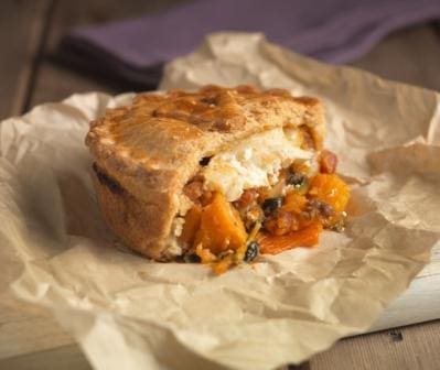 WHEAT Flour (WHEAT, Calcium Carbonate (E170), Iron, Nicontinamide (Vitamin B3), Thiamine Hydrochloride (Vitamin B1)) (GLUTEN), Goat's Cheese (MILK) (10%), Butternut Squash, Sweet Potato (8%), Chopped Tomatoes (Tomato Juice, Citric Acid), Margarine (Vegetable Oil (Rapeseed, Sustainable Palm, Sunflower), Water, Salt, Emulsifier, Citric Acid, Colour (Carotenes), Vitamin A & D, Flavourings), Vegetable Shortening (Sustainable Palm Oil, Rapeseed Oil), Water, Onion,  Red Peppers, Spinach, Plum Chutney (Plums, Cider Vinegar, Apples, Onions, Muscovado Sugar, Raw Cane Sugar, Ginger, Sultanas, Garlic, Salt, Orange Zest, MUSTARD Seed, Nutmeg, Cinnamon, Black Pepper), Rapeseed Oil, EGG, Garlic Puree (Rehydrated Garlic Granules, Citric Acid E330), Salt, Black Pepper, Mixed Herbs. For allergens including cereals that contain gluten