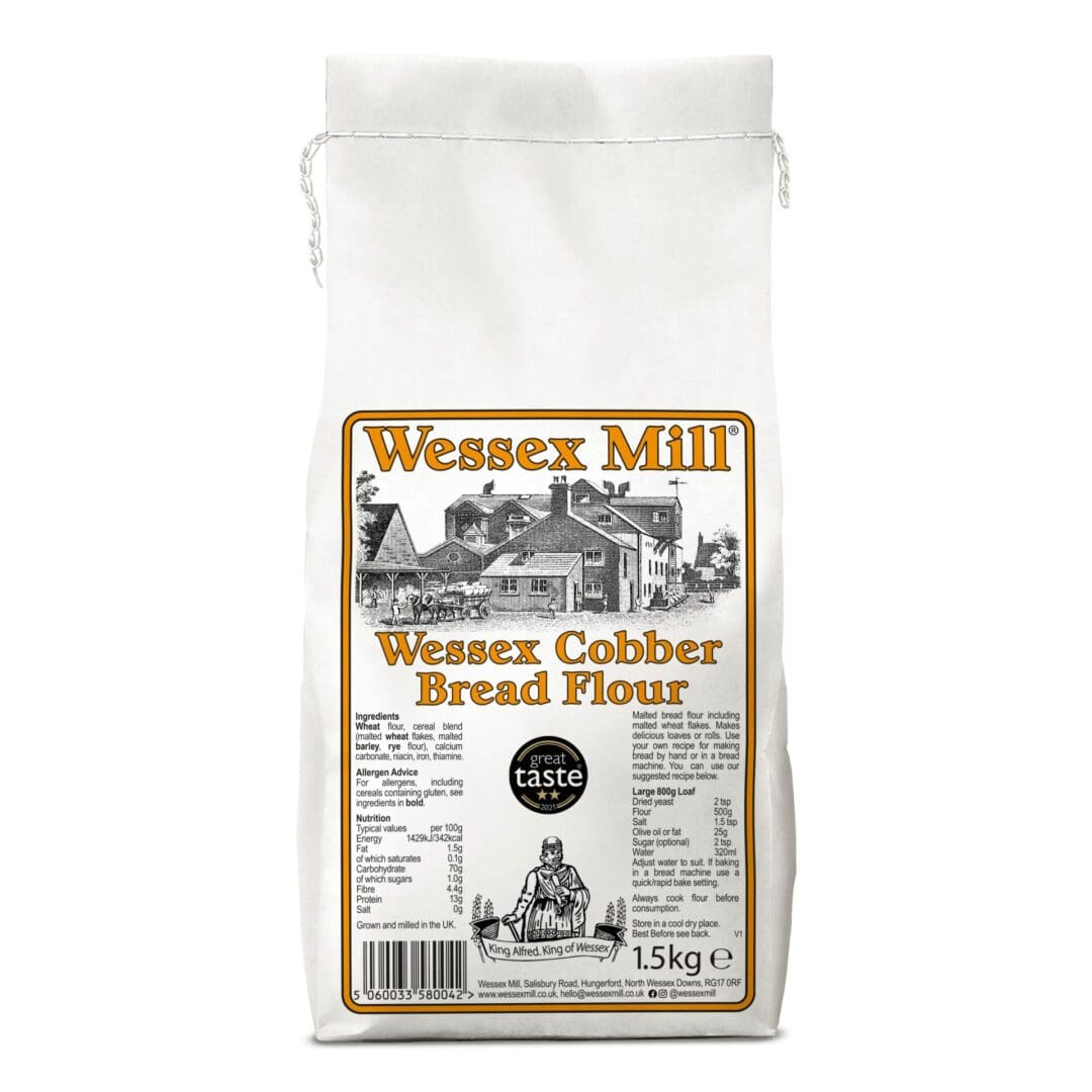 Wessex Mill Cobber Flour is a creamy white flour with malted wheat pieces, ideal for baking artisan breads and pastries. Supplied in 5×1.5kg packs.