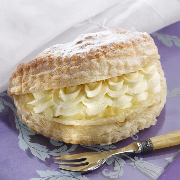 Whipped Cream (43%) [Whipping Cream (MILK), Cream Stabiliser (Sugar, Modified Maize Starch, Stabilisers (E450iii, E401))], WHEAT Flour (contains Calcium carbonate, Iron, Niacin and Thiamin), Apple Filling (16%) [Water, Sugar, Dehydrated Apple Flake, Dextrose, Modified Starch, Acidity Regulator (Citric Acid), Preservative (Potassium Sorbate)], Margarine [Palm Oil, Palm Stearin, Water, Salt, Rapeseed Oil, Emulsifier (E471), Acidity Regulator (Citric Acid), Lemon Juice from concentrate], Sugar, Water, Sweet Dusting [Dextrose, Cornflour, Palm Oil], Salt.