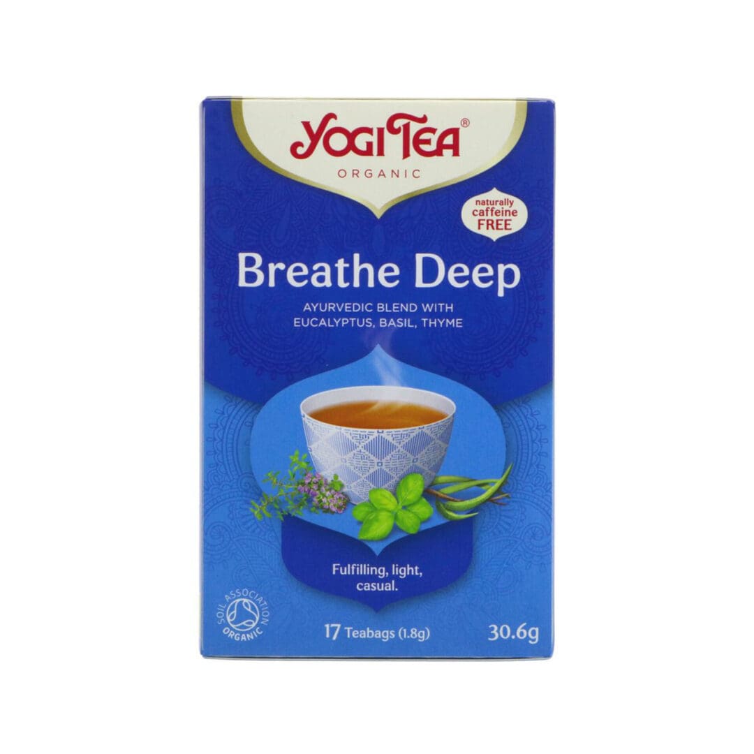 Yogi Organic Breathe Deep Tea is a soothing herbal blend designed to support clear breathing. Available in packs of 6×17 tea bags, ideal for a calming organic tea experience.
